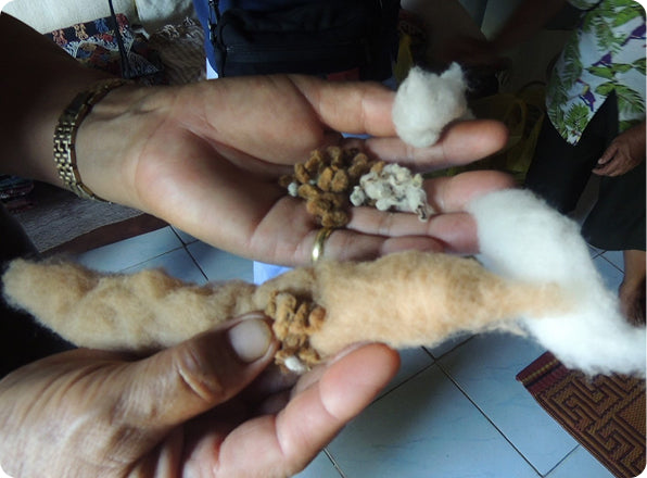 今回購入させていただいた布は、樹皮染め・茶綿・白綿・泥染め・民族柄の5種類。いずれも村で育てた綿と天然染料を用い、丁寧に手織りされたものです。
